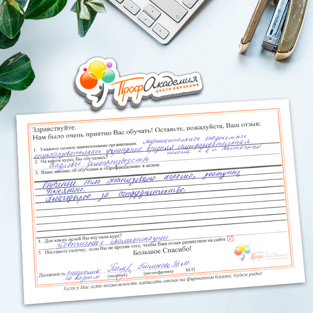 Обучение кадровому делопроизводству прошло успешно, "Профакадемия" предоставила быстрый срок обучения, персонал доброжелательный и вежливый, по всем вопросам отвечали быстро и понятно. Буду рекомендовать Вас своим близким.