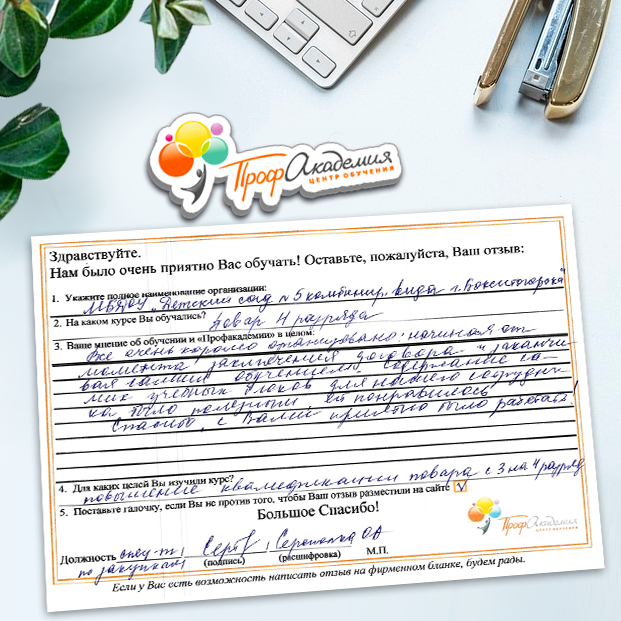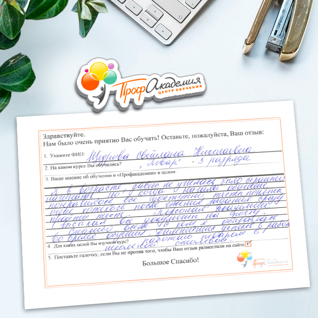 Я в восторге, давно не училась, было страшно начинать, но когда начала обучение, понравилось, все доступно, текст понятен, очень хотелось после чтения задания сразу пройти тест. Персонал академии выслал все документы на почту. Спасибо всем с кем я общалась во время обучения. Дальнейших успехов в работе.