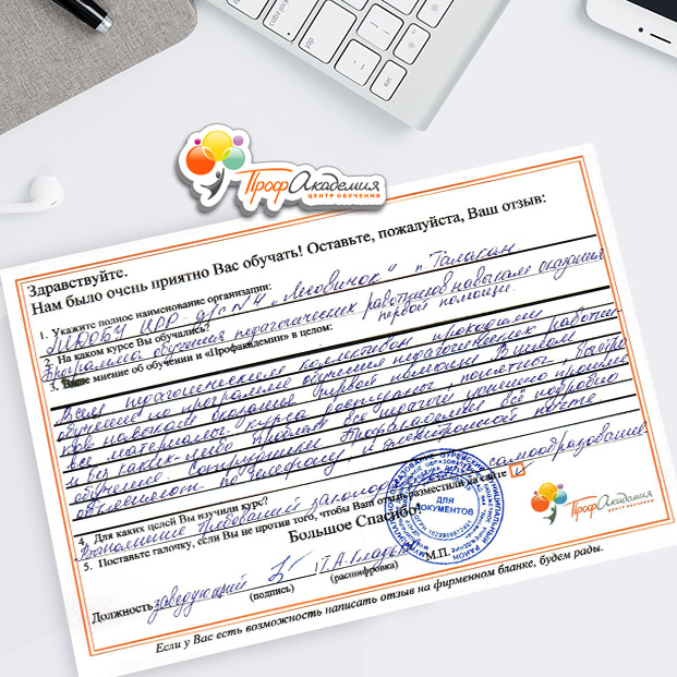 У всех педагогов нашей школы только положительные впечатления от обучения в "Профакадемии" Учебный материал очень интересный. Есть и презентации, и видеоматериалы. Все воспринимается легко и доступно. Все подтемы разложены по полочка, очень удобно для изучения! Очень вам благодарны, планируем и дальнейшее обучения в вашей Академиии.